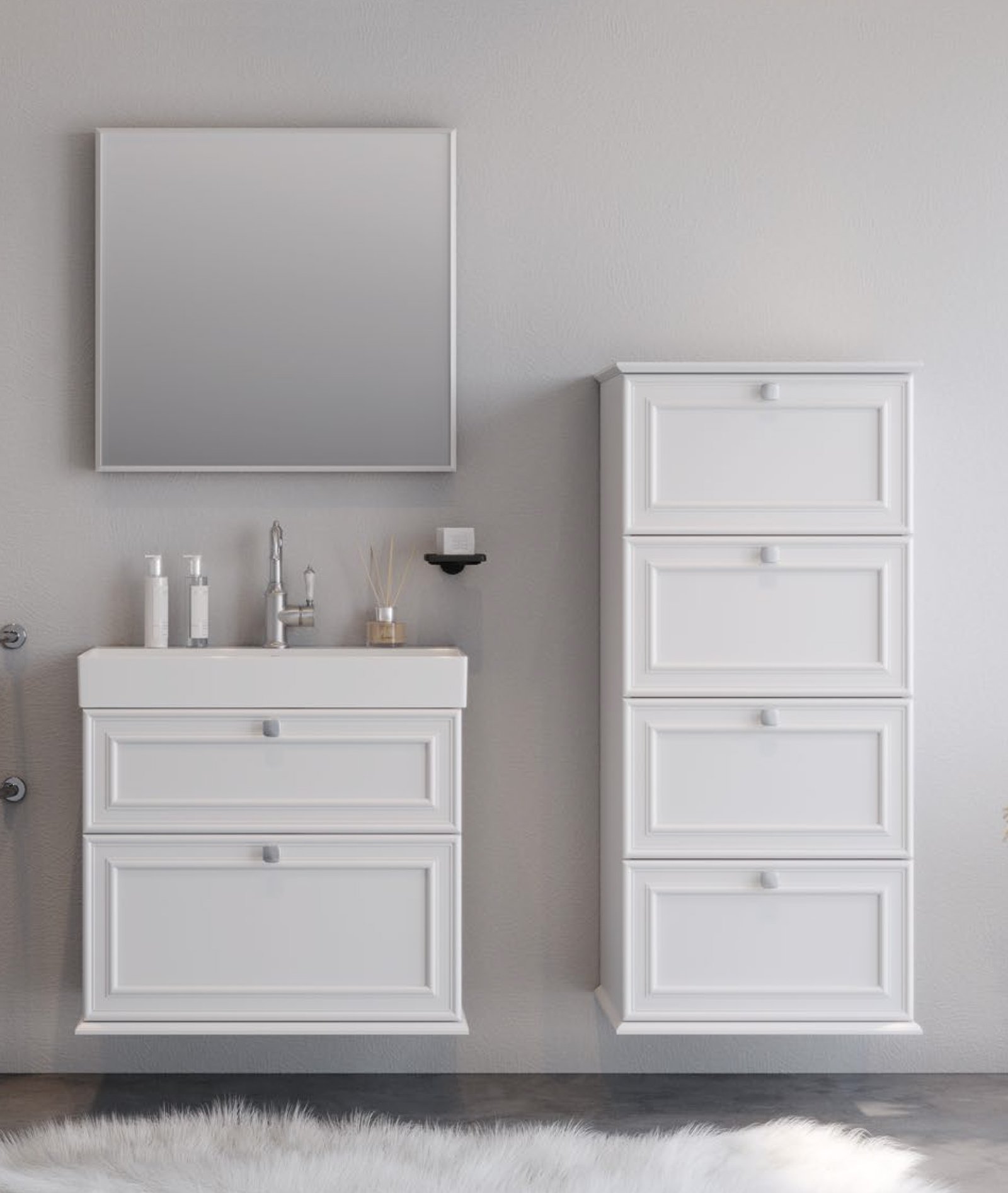ΣΕΤ ΕΠΙΠΛΟΥ ΜΠΑΝΙΟΥ STELLA 70cm χρ.WHITE MAT 9SSTE070WHM Πάγκο 70×45.5x70cm Αποτελείται από: Πάγκος STELLA White mat 70 κρεμαστός σε ματ λάκα και υλικό mdf. Διαθέτει δύο συρτάρια και ένα ντουλάπι για την τοποθέτηση και οργάνωση αντικειμένων. Καθρέφτης τετράγωνος με ένα ντουλάπι στο πλάι από mdf με ματ γκρι λάκα. Νιπτήρας πορσελάνης χρώματος λευκό, κορυφαίας κατασκευής και υψηλής αισθητικής. Διαθέτει οπή υπερχείλισης. Ματ λάκα σε mdf Σετ Έπιπλο Μπάνιου STELLA σε Λευκή ματ απόχρωση αποτελεί ένα μοντέρνο κομμάτι με εργονομικό σχεδιασμό αλλά και λειτουργικότητα. Προσαρμόζεται σε κάθε τύπο μπάνιου. •Πρακτικοί αποθηκευτικοί χώροι •Μηχανισμοί για απαλό και αθόρυβο κλείσιμο •Εύκολη τοποθέτηση •Ετοιμοπαράδοτα προϊόντα Δεν συμπεριλαμβάνονται η μπαταρία, η στήλη και τα διακοσμητικά. Διατίθεται έτοιμο συναρμολογημένο.
