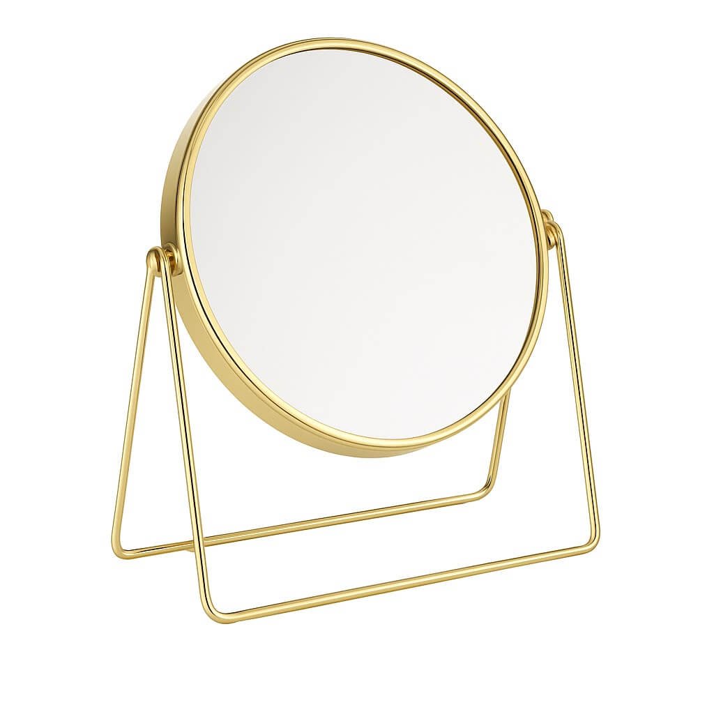 Η στρογγυλή του μορφή δίνει αρμονία και ισορροπία στο περιβάλλον, ενώ η σταθερή βάση εξασφαλίζει άνεση και σταθερότητα στη χρήση για καθημερινό μακιγιάζ, grooming ή περιποίηση προσώπου. Το gold φινίρισμα ενσωματώνεται άψογα με σύγχρονες διακοσμητικές λεπτομέρειες, μεταλλικές επιφάνειες και μοντέρνες μπαταρίες, τονίζοντας το design του χώρου σας με μια διακριτική, luxury αισθητική.